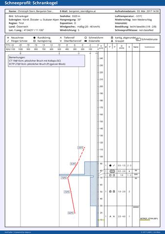 Schneeprofil Axamer Kögele. Hartes Schneebrett auf einer bodennahen Schwachschicht, die an einer schneearmen Stelle gestört wurde. Entscheidend für den Abgang war die negative Veränderung des Brettes durch Sturm und Schneefall oberhalb der Schwachschicht.