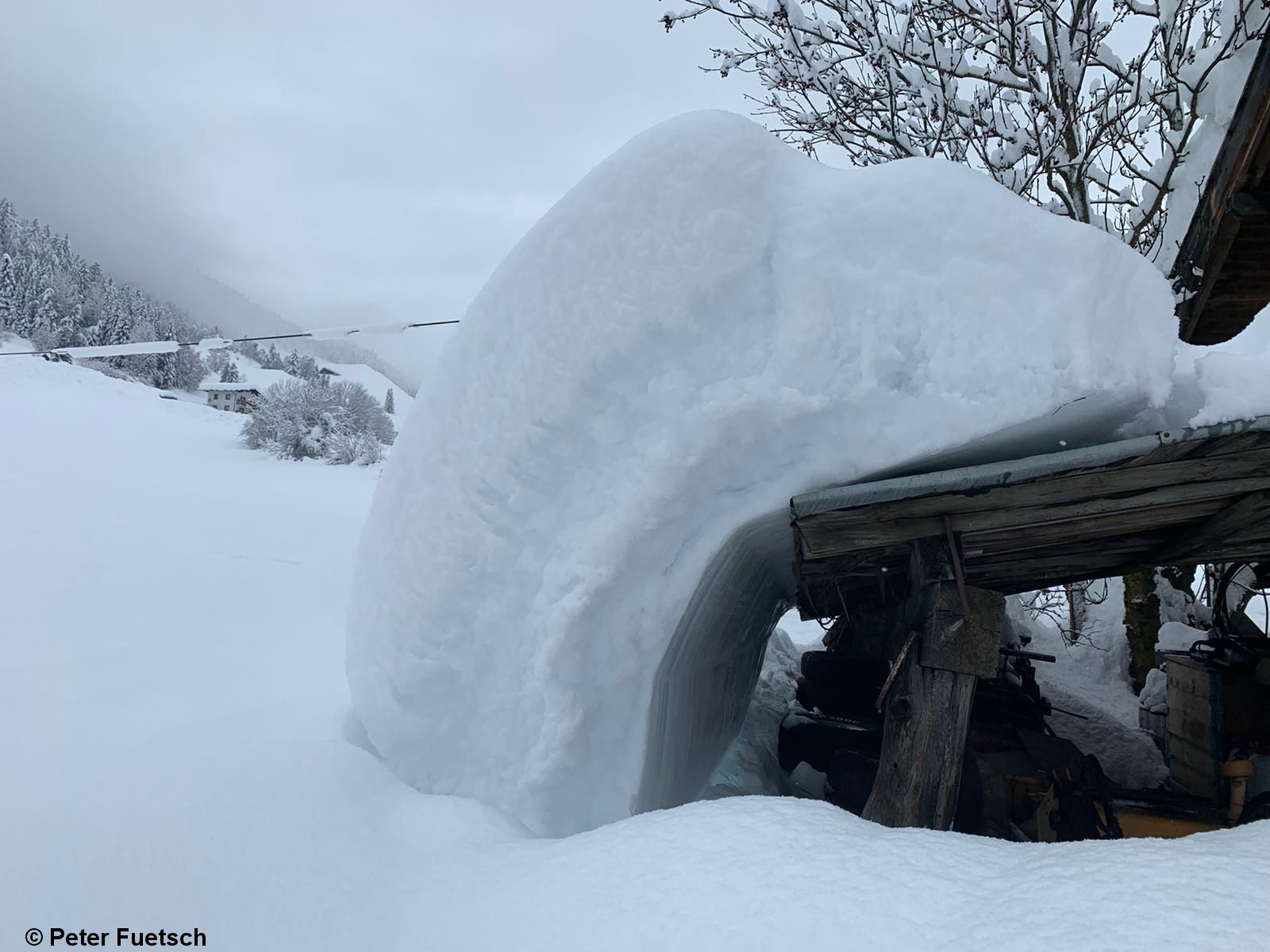 | Mühsames Abschaufeln von Hausdächern, St. Sigmund im Sellrain (Foto: 06.12.2020) |