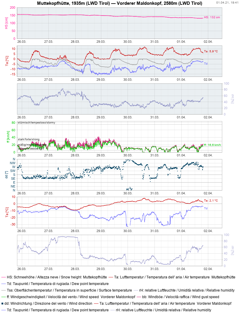 Aktuell gehen wir für den morgigen Karfreitag, 02.04.2021, davon aus, dass weiter im Norden die Nacht großteils bedeckt ist, es zudem immer wieder lokale Schauer geben kann. Die Schneedecke wird deshalb nicht oder nur ungenügend auskühlen können. Die Bedingungen sollten deshalb bereits während der Morgenstunden ungünstig sein. Besser ist es dann nur schattseitig in großen Höhen – aber da kommt man ja nicht ganz so leicht, ohne einen ungünstigen Bereich passieren zu müssen…