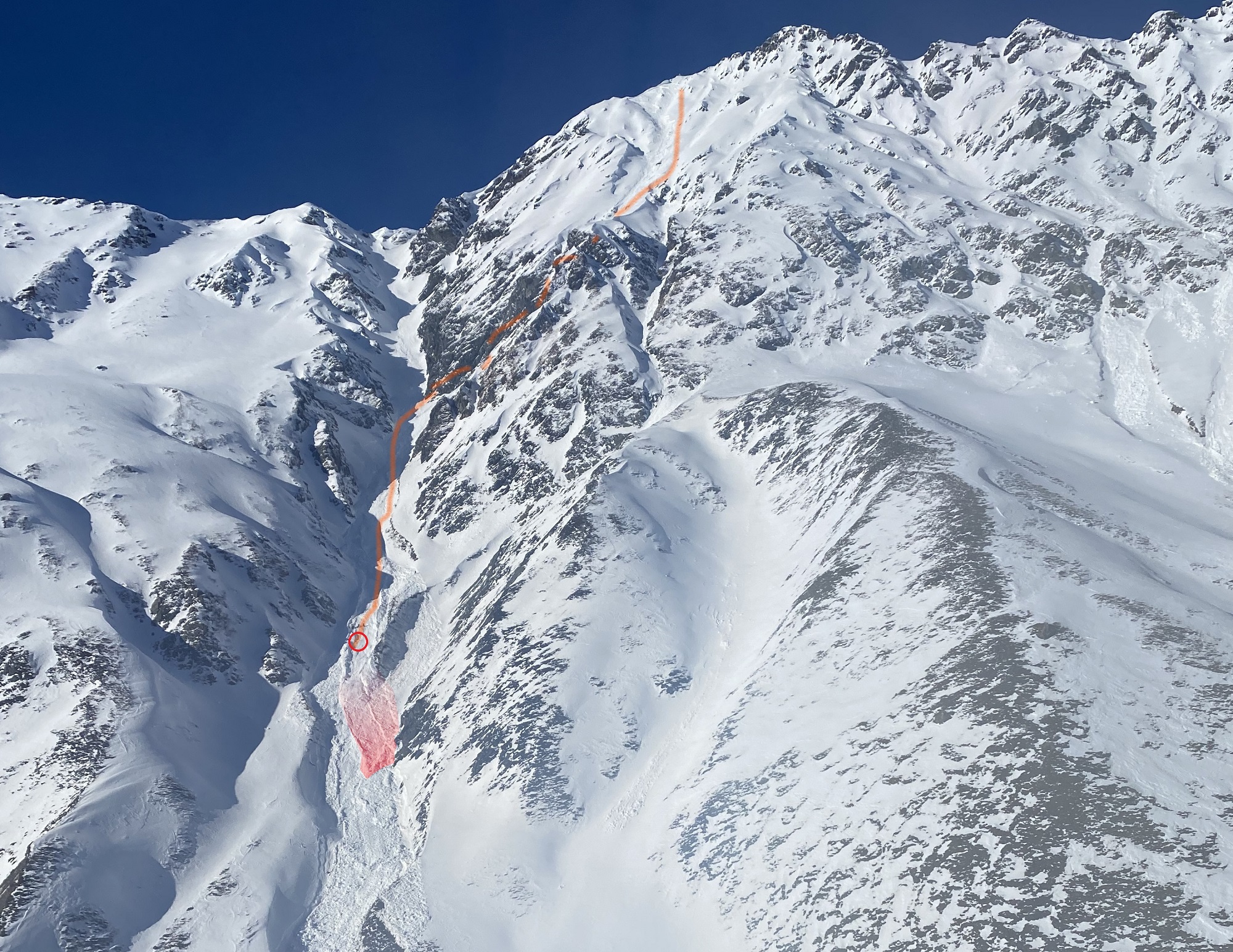 The slab avalanche triggered in extremely steep terrain (>40°) on a SE slope at about 2800 m altitude. At the point of fracture the avalanche was about 20 m wide; it plummeted a length of 580 m.