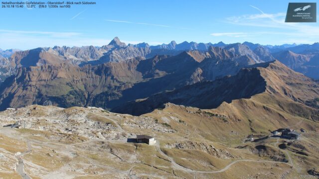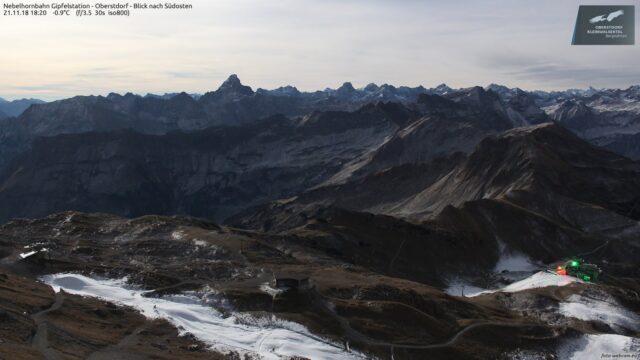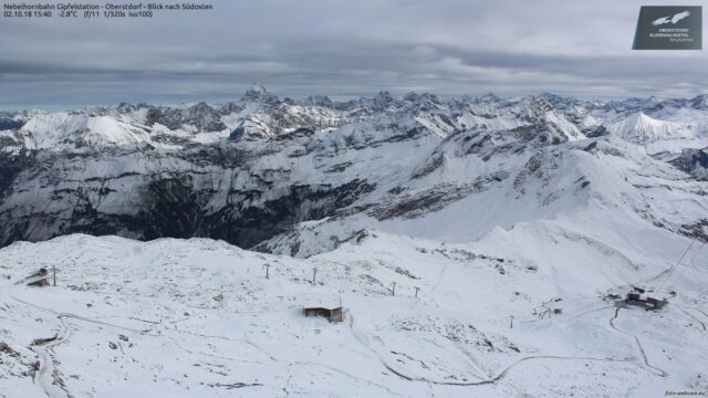 “Zuccherato“ per un breve periodo, ma la neve si è sciolta velocemente. Vista dal monte Nebelhorn a Oberstdorf in direzione sudest il giorno 02.10.2018 (© foto-webcam.eu) |