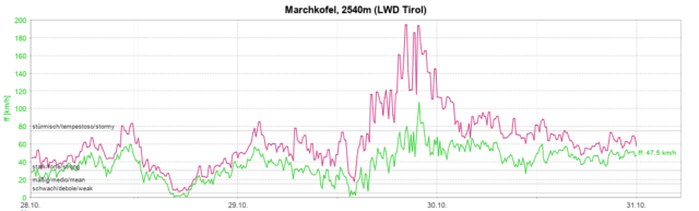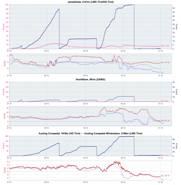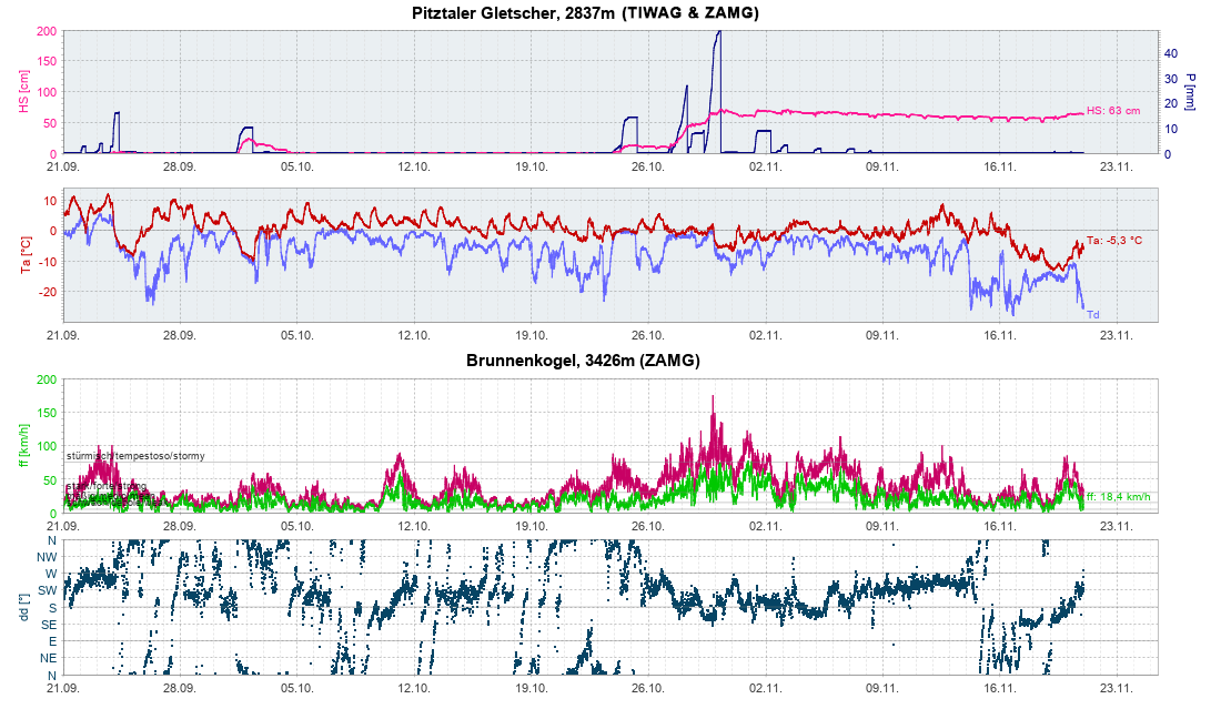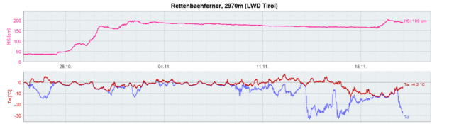 Grafico della stazione di rilevamento al Rettenbachferner: anche le nevicate a partire dal 27.10. erano importanti per gli eventi valanghivi (si riconoscono le ultime cadute di neve fresca che hanno portato bellissima neve farinosa ad alta quota) |