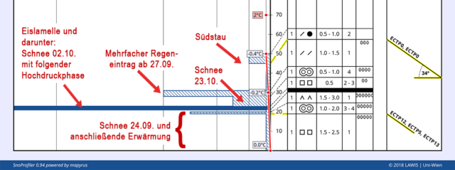 E‘ sempre importante, per un’analisi completa del manto nevoso, seguire lo sviluppo dalle prime nevicate in autunno: una prima nevicata ha imbiancato le montagne il 25.08.2018 (un fronte freddo ha messo termine al quinto agosto più caldo nella storia dei rilevamenti meteorologici). Questa neve si è sciolta molto velocemente, cosa che è capitata, in molto posti, anche dopo le nevicate successive, il 01.09., 07.09., 24.09. e 01.10.
