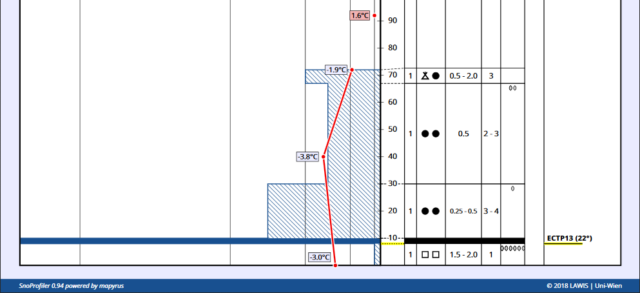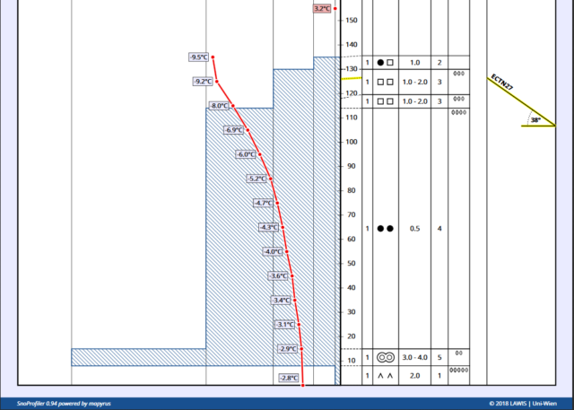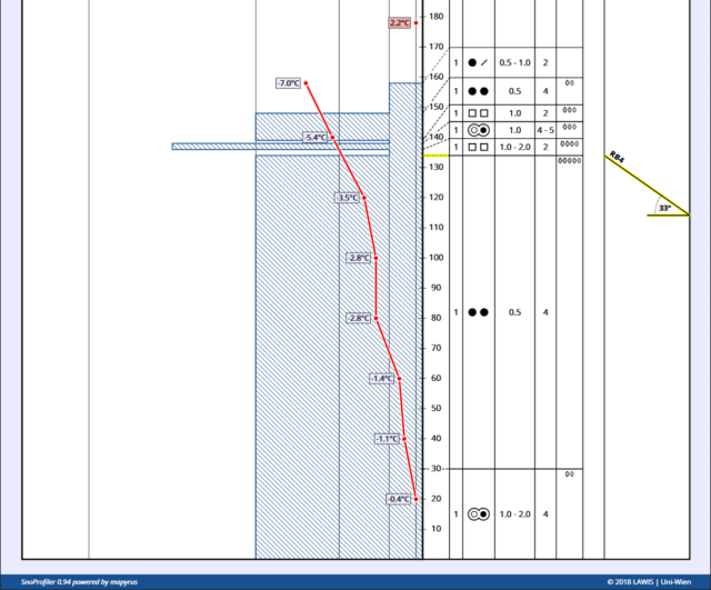 Profilo di neve al ghiacciaio di Hintertux nelle Alpi dello Zillertal del 15.11.2018; nordovest, 3070 m, 38°. Simile al profilo precedente si riconosce la neve scorrevole a debole coesione, vicino al suolo, sotto una crosta dura. (© Stephan Mitterer) |