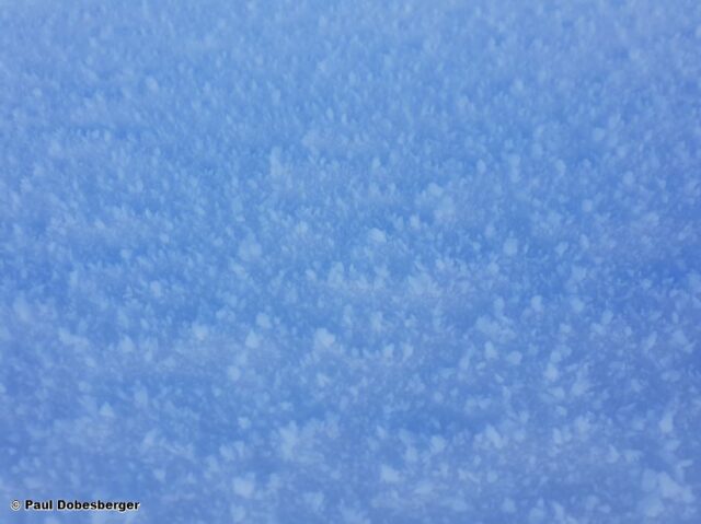 Quanto detto prima, non era però vero per le zone a quota molto alta, in particolare aree glaciate e all’ombra. Nonostante l’ottobre soleggiato e caldo, superiore alla media (il decimo più caldo della storia dei rilevamenti meteorologici), in quelle zone la neve si è fermata. Spesso, sulla superficie del manto nevoso si è formata una crosta da rigelo più o meno spessa. In alcuni casi, la neve sottostante era soggetta a metamorfismo, perdendo la coesione. Il risultato: alla base di alcuni dei profili di neve a nostra disposizione si trovano dei cristalli di debole coesione, a grani angolosi oppure neve scorrevole – possibili strati fragili per valanghe a lastroni.