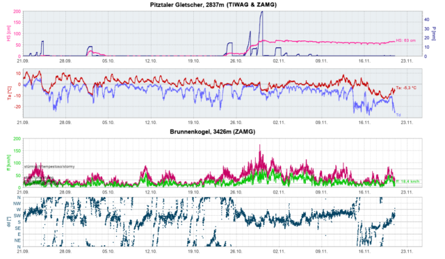 Uno sguardo alla stazione meteorologica in alta quota sul ghiacciaio del Pitztal nelle Alpi dell’Ötztal aiuta a capire meglio l’andamento meteorologico dell’inverno in corso: le nevicate importanti, almeno in parte, per il manto nevoso sono cadute nei giorni 24.09., 01.10. e a partire dal 24.10.2018. Colpisce il lungo periodo di bel tempo dall’inizio di ottobre e le grandi quantità di precipitazioni a fine ottobre abbinate a tempeste. |