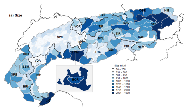 Dimensioni delle regioni di previsione dell’arco alpino. Più scuro è il colore, più estesa è la regione. (©Frank Techel, 2018) |