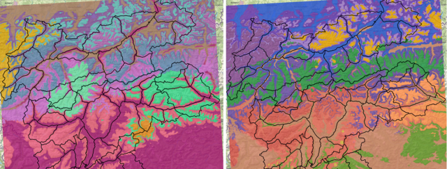 Risultati dell’analisi aggregata in cluster degli inverni 2011/12 (a sinistra) e 2014/15 (a destra) per il Tirolo e l’Alto Adige, con le nuove 29 rispettivamente 20 micro-regioni. |