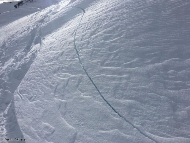 La formazione di crepe indica l’elevata fragilità del manto nevoso. Alta valle della Zillertal (Foto: 07.12.2019)