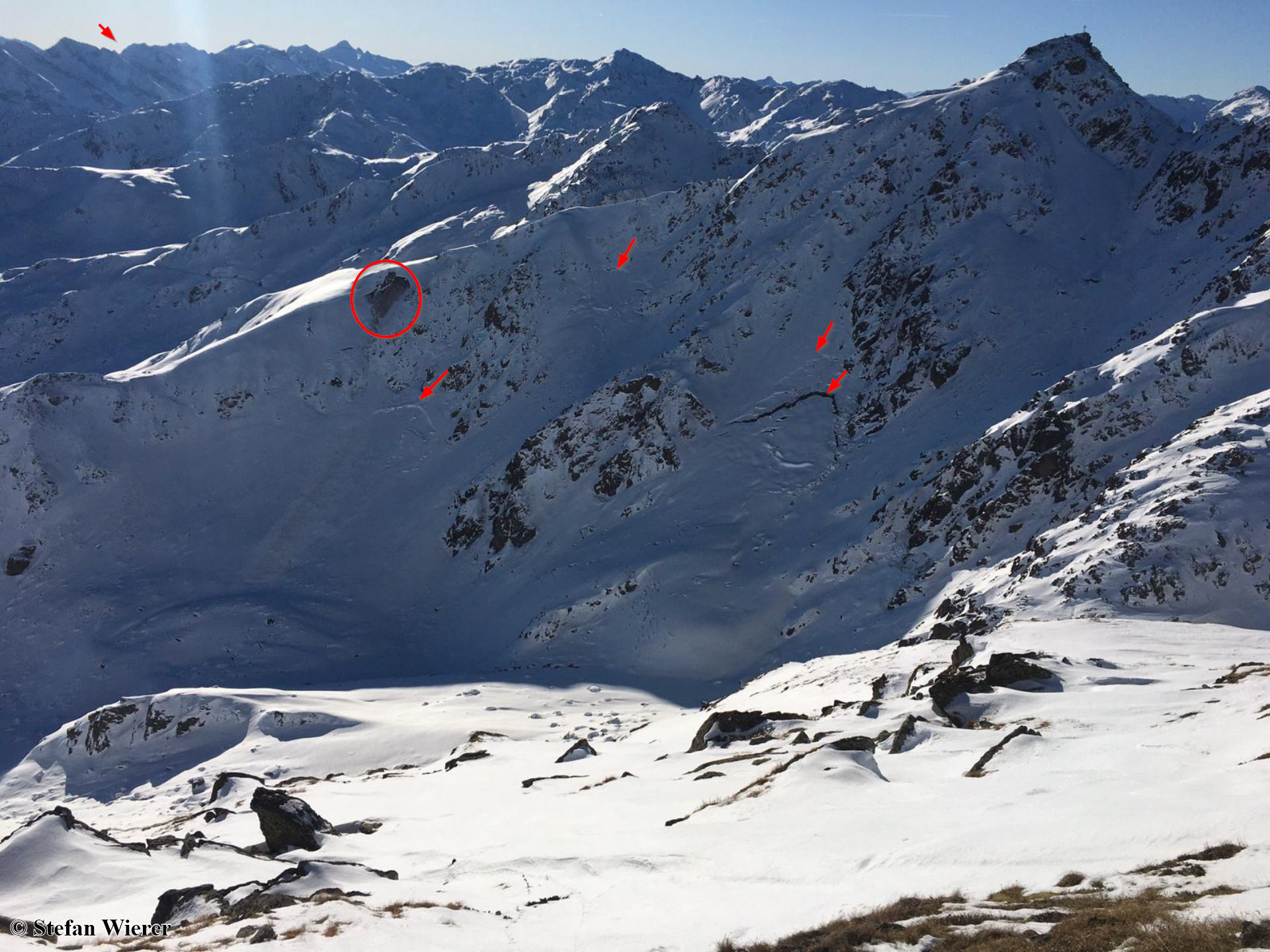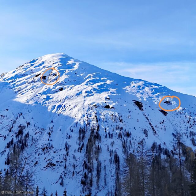Ellissi: valangha per scivolamento di neve fresca. Frecce: valanghe per scivolamento di neve più vecchie oppure crepe (bocche da balena). Alpi di Tux (Foto: 12.12.2019)
