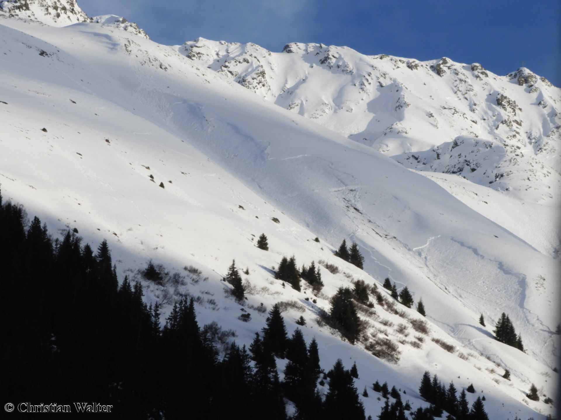 La foto mostra una valanga a lastroni distaccatasi il 31/01/2020 in un pendio esposto ad ovest al di sotto del monte Predigberg nella Silvretta. Altitudine  2200 m slm circa. Una persona è stata trascinata dalla valanga per circa 400 metri. Adesso, per la pioggia e il riscaldamento, bisogna aspettarsi simili valanghe  spontanee. (Foto: 31.01.2020)