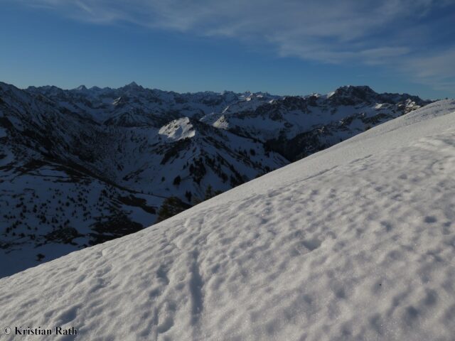 In quote basse e medie si aspettano soprattutto valanghe bagnate di neve a debole coesione e valanghe per scivolamento di neve. Valle di Tannheim (Foto: 02.02.2020)
