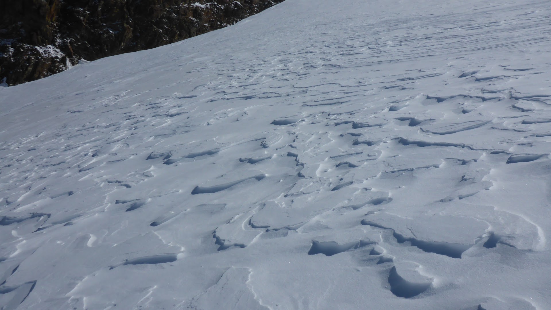 | Durch den vielen Wind ist die Schneeoberfläche stark vom Wind gezeichnet. (26.03.2019) |
