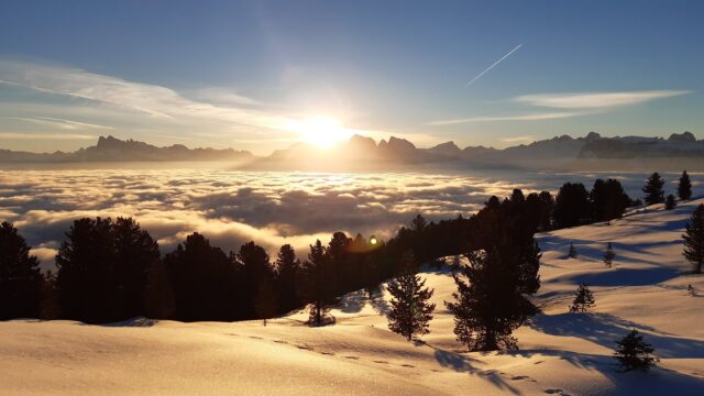 | Gebietsweise gab es am Vormittag über einigen Tälern auch Hochnebel, was zu einer zusätzlichen Anfeuchtung der Schneedecke unterhalb des Nebels führte. Im Bild der Nebel über dem Eisacktal vom Rittner Horn aus gesehen. (Foto: 21.02.2021)