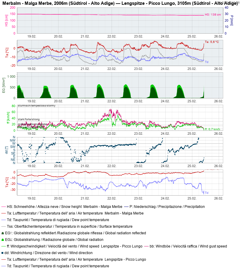 | Im Bild die Daten des Schneemessfeldes Merbalm in Prettau und der Windstation Lengspitze. Die Schneehöhe ist in den vergangenen 10 Tagen um ca. 10 cm zurückgegangen, v.a. die trockenen Luftmassen verhindern einen stärkeren Rückgang. Die Lufttemperatur erreichte am 23. Februar am Schneemessfeld schon 8.5°C, an mehreren Tagen wurden an der Windstation auf 3105 m schon Plusgrade gemessen. Der Wind war meist kein großes Thema, in der Nacht vom 21. auf den 22. Februar wehte er aber teils kräftig aus südwestlichen Richtungen.