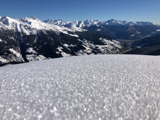Zudem kann man mit dem Stationsgraph ein weiteres Phänomen erklären, welches man derzeit verbreitet beobachten kann: Oberflächenreif, der sich bei windschwachen Wetterlagen mit tiefen Temperaturen und hoher Luftfeuchtigkeit (>70 %) an der Schneeoberfläche bildet. Dazu werfen wir einen Blick auf das vierte Panel mit den Temperaturen am 05.11.2021. Liegt der Taupunkt (blaue Linie) über der Oberflächentemperatur (graue Linie), kristallisiert der in der Luft vorhandene Wasserdampf an der Oberfläche und bildet die formschönen Oberflächenreifkristalle aus. Allein gesehen stellt Oberflächenreif kein Gefahrenpotential dar. Erst wenn er von gebundenen Schneeschichten überdeckt wird, wird es gefährlich. Eingeschneiter Oberflächenreif gilt als eine der kritischsten Schwachschichten der Schnee- und Lawinenkunde. Sollte der Oberflächenreif bis zum nächsten Schneefall bestehen bleiben, wird sich die Lawinensituation drastisch verschärfen.