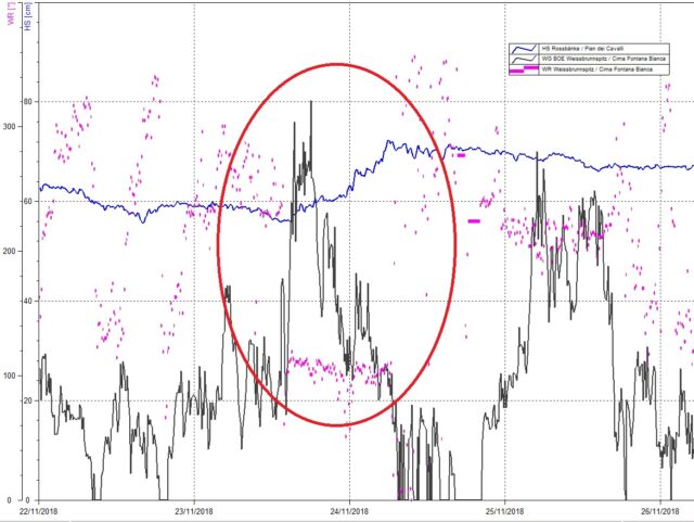 La zona di distacco della valanga era solo in parte individuabile e difficilmente primetrabile: il forte vento di martedì 27/11 aveva cancellato gran parte delle tracce costruendo un nuovo lastrone di neve ventata.
