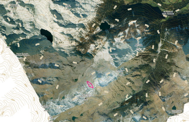 | Corografia della zona dell’incidente con segnata in rosa la valanga |