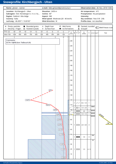 Il profilo del manto nevoso è stato fatto in una zona protetta qualche centinaia di metri sotto la presumibile linea di distacco.