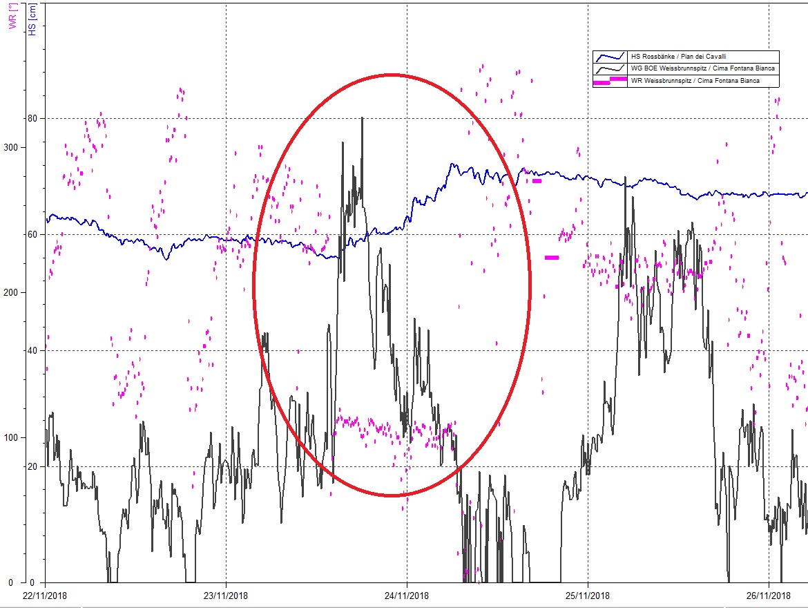 Il vento registrato dalla stazione di Cima Fontana Bianca durante la nevicata ha raggiunto raffiche di 16 m/s.