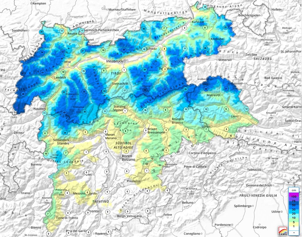 Con le precipitazioni degli ultimi giorni è caduta neve in molte parti dell’Alto Adige. Ci è giunta comunicazione dal territorio di oltre 30 cm di neve fresca nelle zone settentrionali (Casere 34 cm, Melago 34 cm, Riva di Tures 30 cm, Pfelders 30 cm, Pennes 17 cm). Sulle Dolomiti e nelle parti meridionali del territorio le precipitazioni sono state molto inferiori e a tratti completamente assenti. Il limite della nevicata era compreso tra i 700 e 1200 m.