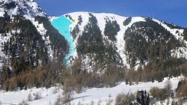 | Tracciato della valanga dell’incidente di Lazuan. La freccia gialla indica il punto di ingresso nel canale della vittima (17.03.2019) |