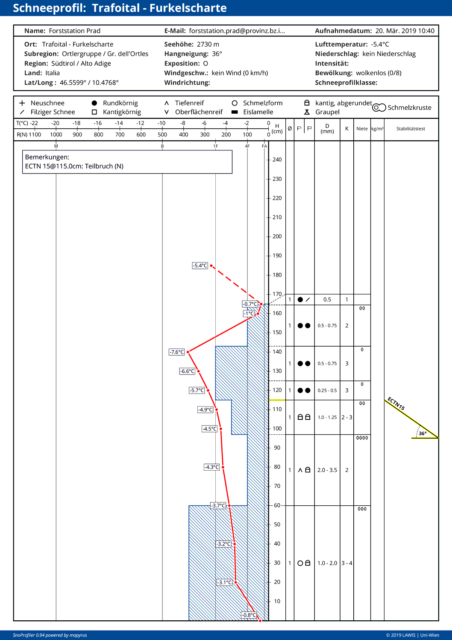 Analisi del manto nevoso ne confermano la stabilità attuale. Gli strati deboli sono pochi e tendono a non favorire il propagarsi della frattura. Il test ECT (Extended Column Test, in italiano: Test della colonna estesa) eseguito sul profilo rappresentato qui sotto, per esempio, mostra come una frattura è sì avvenuta, ma anche come questa non sia stata in grado di propagarsi. Ulteriori profili del manto nevoso li trovate sulla nostra pagina al seguente link.