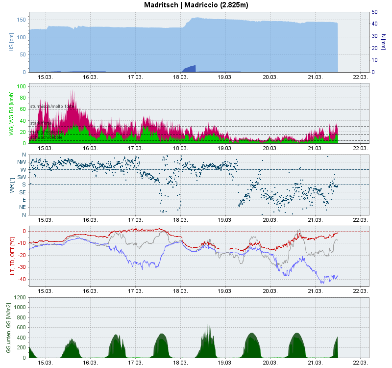 Che l’aria in Alto Adige è al momento molto secca lo mostrano anche i valori misurati. I punto di rugiada alla stazione di Madriccio il 21 marzo si trovava a -40°C. Il punto di rugiada è un valore assoluto dell’umidità dell’aria. Quanto più basso il punto di rugiada, tanto più secca è l’aria. Questo ha un effetto raffreddante sul manto nevoso, visto che comporta la sublimazione della neve, ovvero, fa sì che la neve passa dallo stato solido direttamente allo stato gassoso. Questo effetto sul manto nevoso favorisce la presenza di neve polverosa, nonostante la radiazione solare e il rialzo termico.