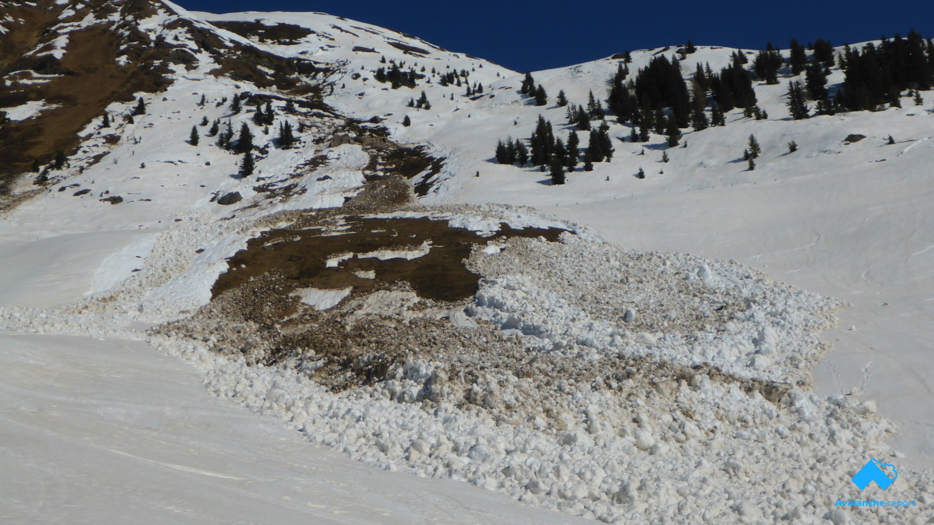 | Valanga di neve bagnata che ha trascinato con sé il vecchio manto nevoso completamente bagnato |