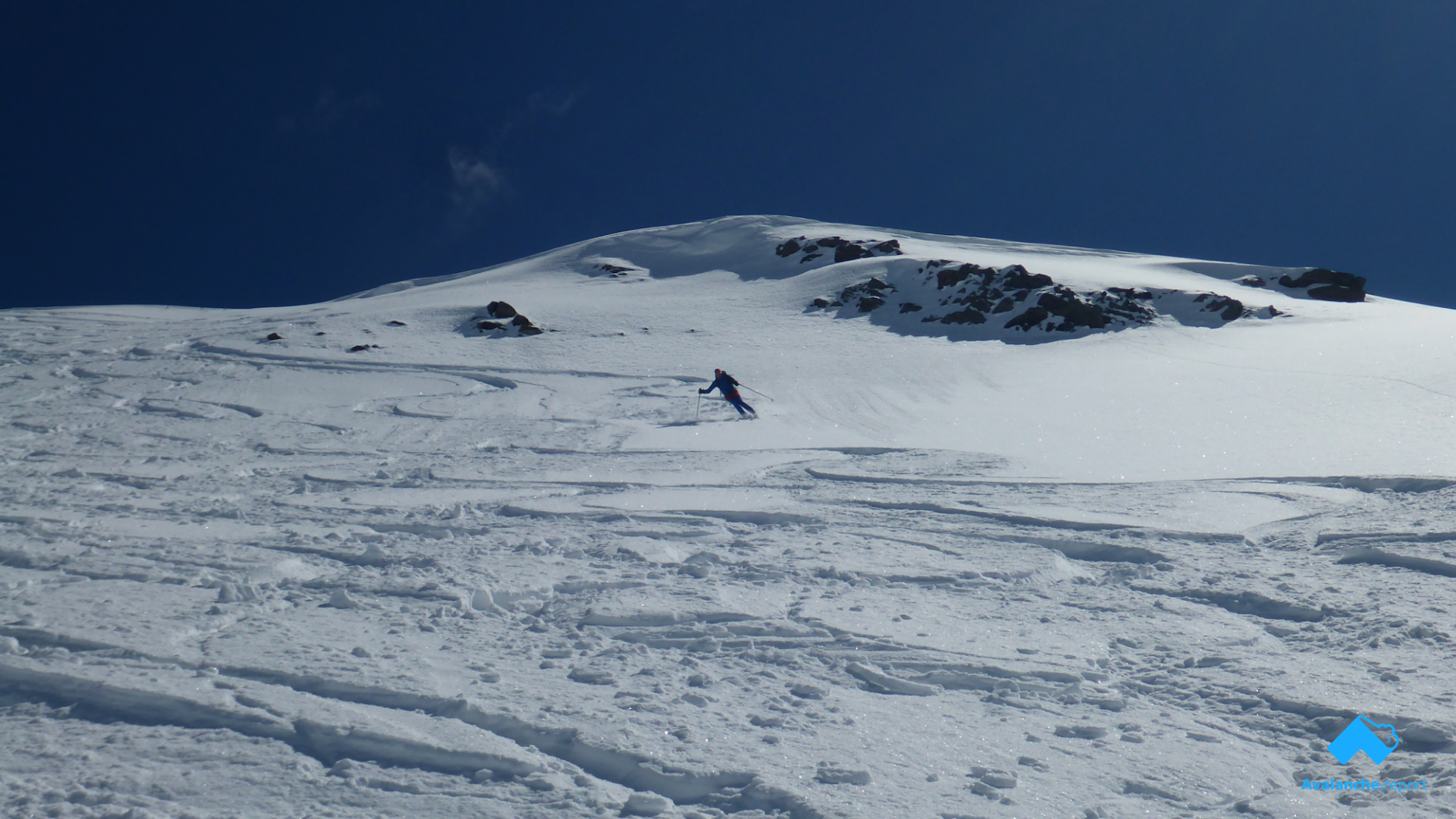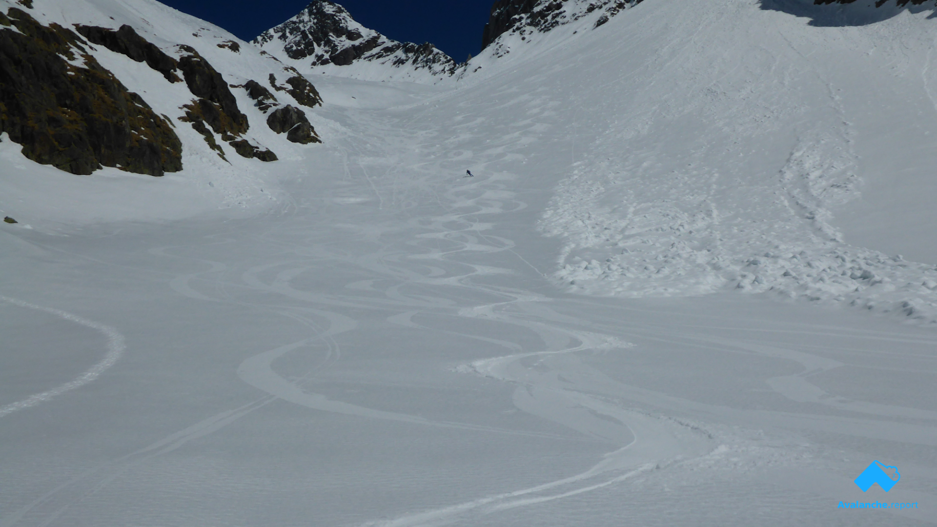 | Discesa su firn dal Giogo di Riomolino nelle Vedrette di Ries, pendio esposto ad ovest (foto:20.04.2019). |