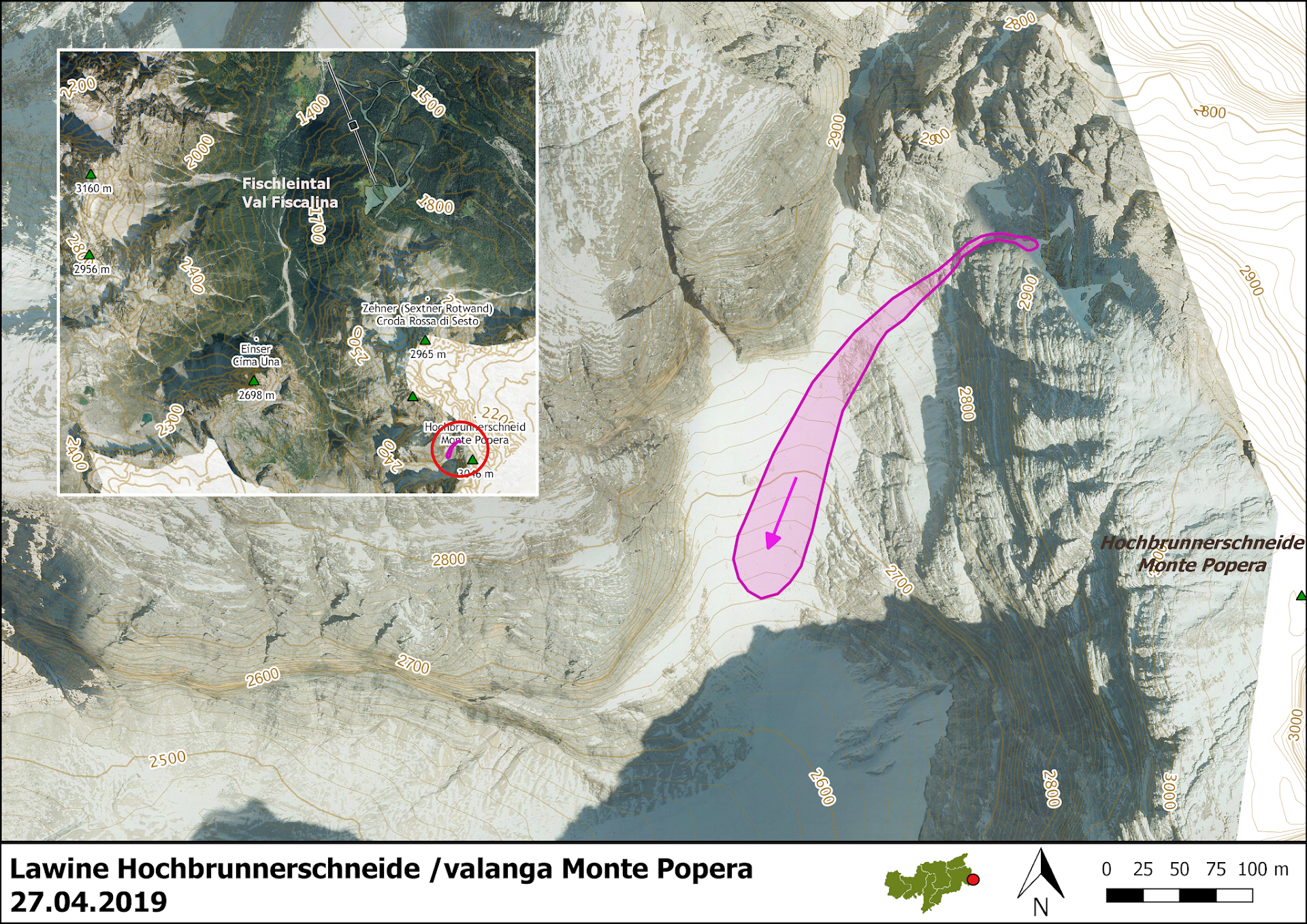 | Cartografia della valanga sotto il Monte Popera dal 27.04.2019. |