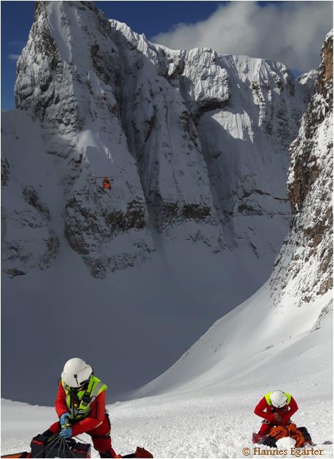 | I soccorritori in azione sul cono di valanga sotto il Monte Popera (foto: Hannes Egarter, 27.04.2019). |