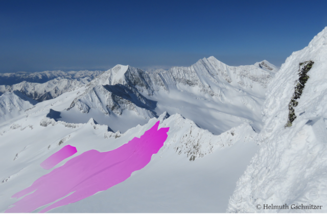 | Vista sulla valanga distaccata a distanza dal Möselekopf. Al centro si vede la Cima Bianca, sullo sfondo il Gran Pilastro (foto: Helmuth Gschnitzer, 01.05.2019) |