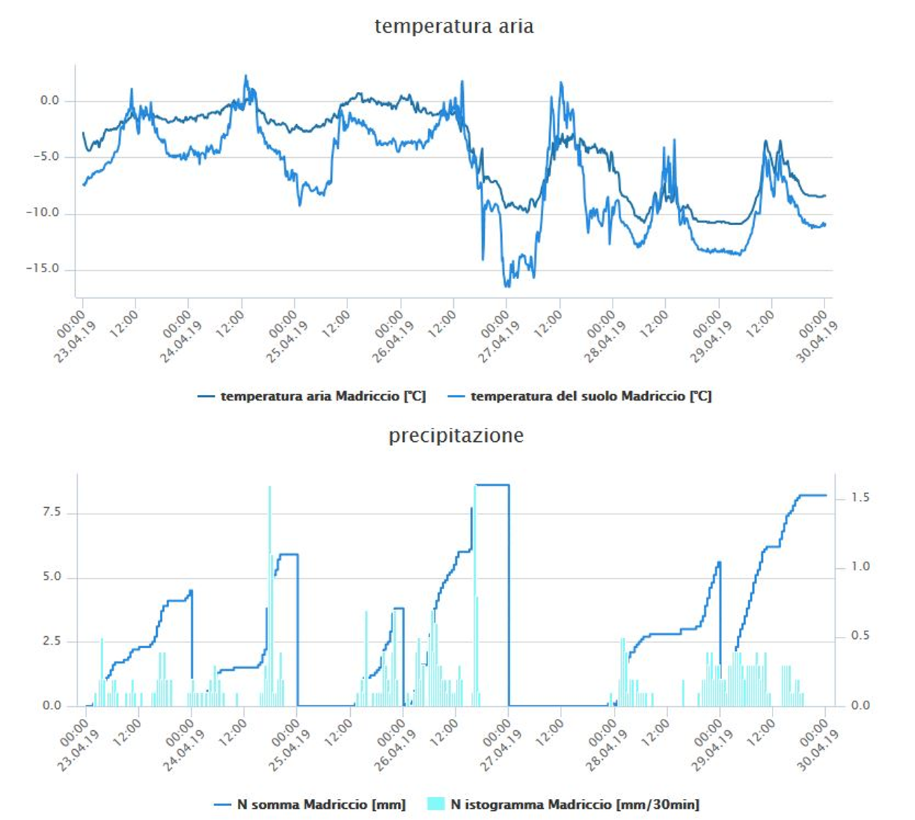 | Valori misurati dalla stazione automatica di Madriccio/Solda a 2825 m. Risulta evidente il calo della temperatura durante la nevicata del 26.04. |