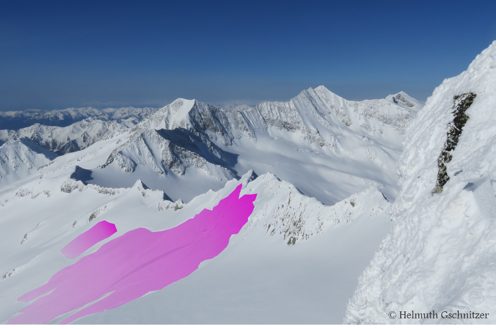 | Vista sulla valanga distaccata a distanza dal Möselekopf. Al centro si vede la Cima Bianca, sullo sfondo il Gran Pilastro (foto: Helmuth Gschnitzer, 01.05.2019) |