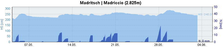 Il mese di maggio appena passato entrerà negli annali storici come particolarmente freddo. Infatti, le temperature erano di 2,5 fino a 3 °C al di sotto della media storica. Anche le precipitazioni erano fuori dal comune, infatti superiori alla media dal 30 al 60%. Questa combinazione ha fatto sì, che in montagna si è accumulata un bel po’ di neve.