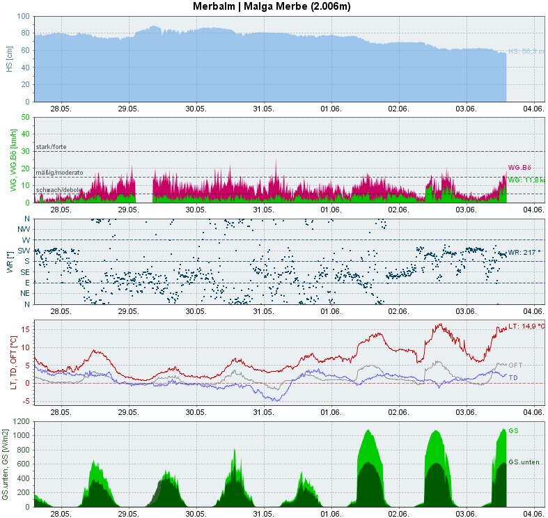 Il mese di maggio appena passato entrerà negli annali storici come particolarmente freddo. Infatti, le temperature erano di 2,5 fino a 3 °C al di sotto della media storica. Anche le precipitazioni erano fuori dal comune, infatti superiori alla media dal 30 al 60%. Questa combinazione ha fatto sì, che in montagna si è accumulata un bel po’ di neve.