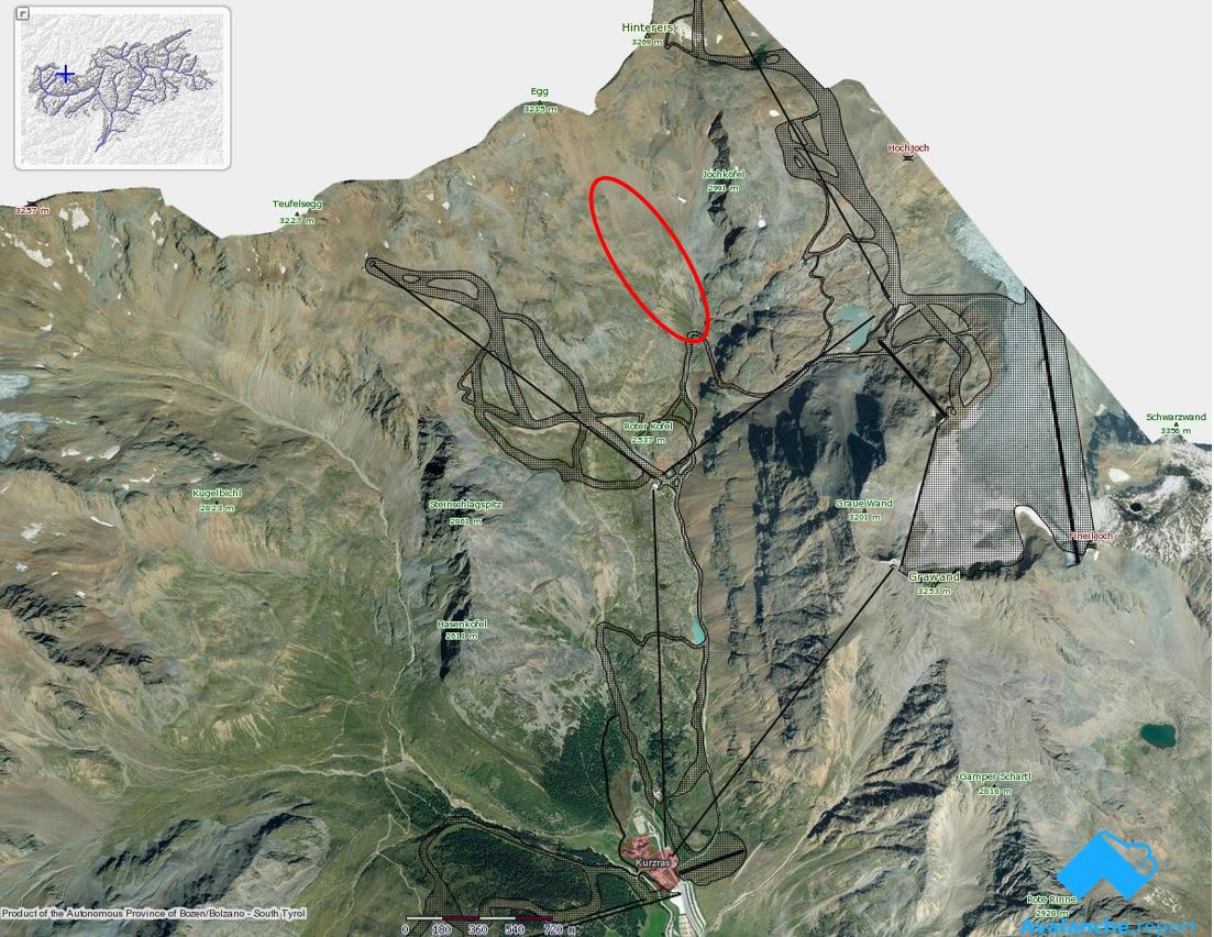 | L’elisse rossa evidenzia la zona dell’incidente nel comprensorio sciistico della Val Senales |