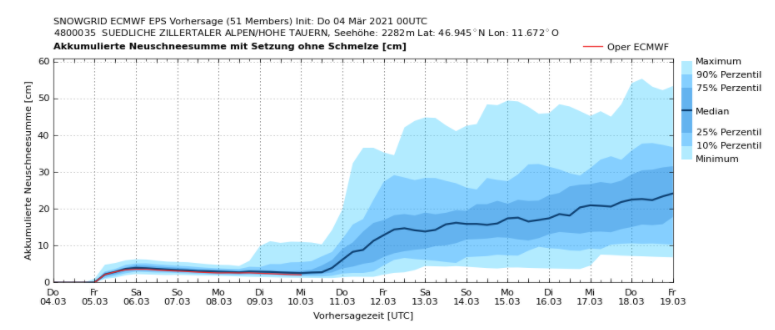 Grafico con la previsione di neve fresca per i prossimi 15 giorni per la zona delle Alpi dello Zillertal