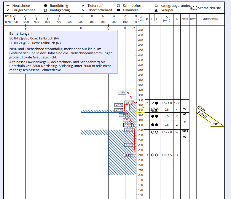 In generale il manto nevoso è spesso irregolare e influenzato dal vento e dal sole. Localmente si trovano anche notevoli quantità di neve pallottolare, formatasi a causa dei rovesci a carattere convettivo degli ultimi giorni. Se ricoperta da altra neve, questa neve pallottolare rappresenta un importante strato debole.