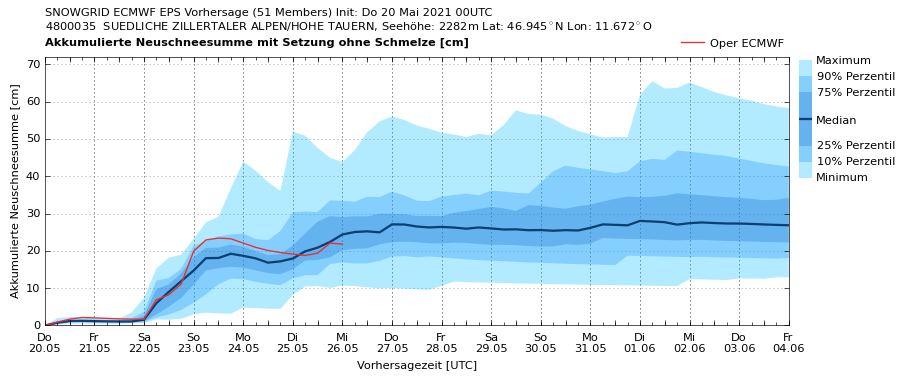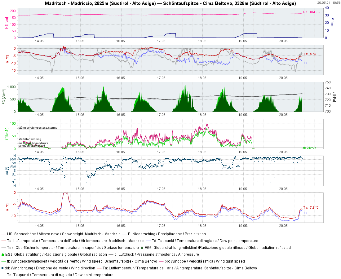 | Contrasti: in valle situazione primaverile con prati verdi e sui monti condizioni invernali. Vista dall’osservatorio di Collepietra verso il Latemar: (Foto: https://www.foto-webcam.eu/, 20.05.2021) |