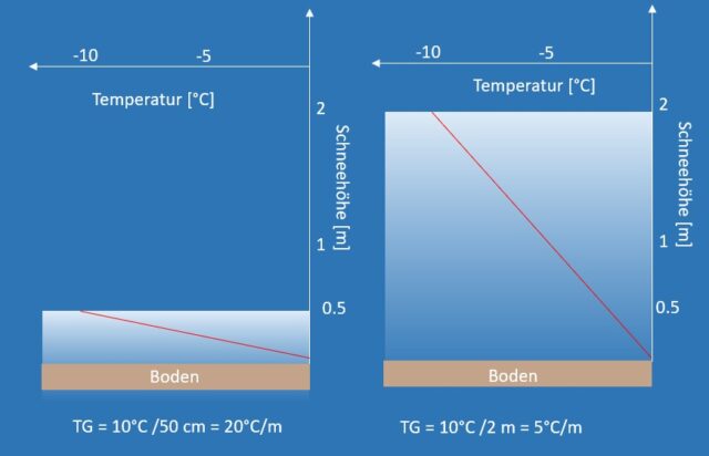 Cosa succede con un forte gradiente, cioè quando la temperatura alla base è molto maggiore rispetto alla temperatura alla superfice, in un manto nevoso di poco spessore? Semplificando al massimo senza entrare nei dettagli della cosa, si può dire che i cristalli di neve si trasformano, assumendo forme più grandi e angolari. Queste forme dei cristalli hanno poca coesione tra di loro e formano quindi degli strati deboli.