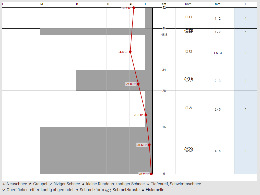 Nella parte inferiore del manto nevoso in molti punti si trovano grandi cristalli sfaccettati, a volte anche cristalli a calice. Vicino al terreno, a causa delle piogge di inizio dicembre e del successivo rigelo , questi cristalli hanno sviluppato una struttura simile ad una crosta in molti punti, ma cedono rapidamente quando vengono sollecitati.