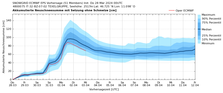 La situazione cambierà poco nei prossimi giorni. Dopo la nevicata di oggi, 28 marzo, domani cadrà ancora qualche fiocco di neve. Sabato pomeriggio ricomincerà a nevicare intensamente ad alta quota, soprattutto nelle zone di Stau da sud. Secondo le previsioni odierne, le maggiori quantità di neve fresca cadranno da domenica a lunedì, soprattutto nelle zone di Stau da sud. Nevicherà anche nelle altre zone della provincia.