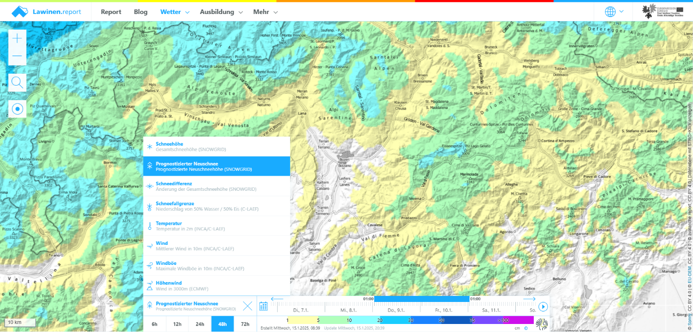 Il bollettino valanghe è stato ampliato con nuove mappe e parametri meteorologici più dettagliati, con particolare attenzione alle informazioni riguardanti il vento. Anche i modelli meteorologici su cui si basano le mappe sono stati modificati. Sotto le mappe è possibile selezionare l’ora e il periodo desiderato. A seconda della mappa, cliccando su di essa è possibile visualizzare anche il valore calcolato del parametro.