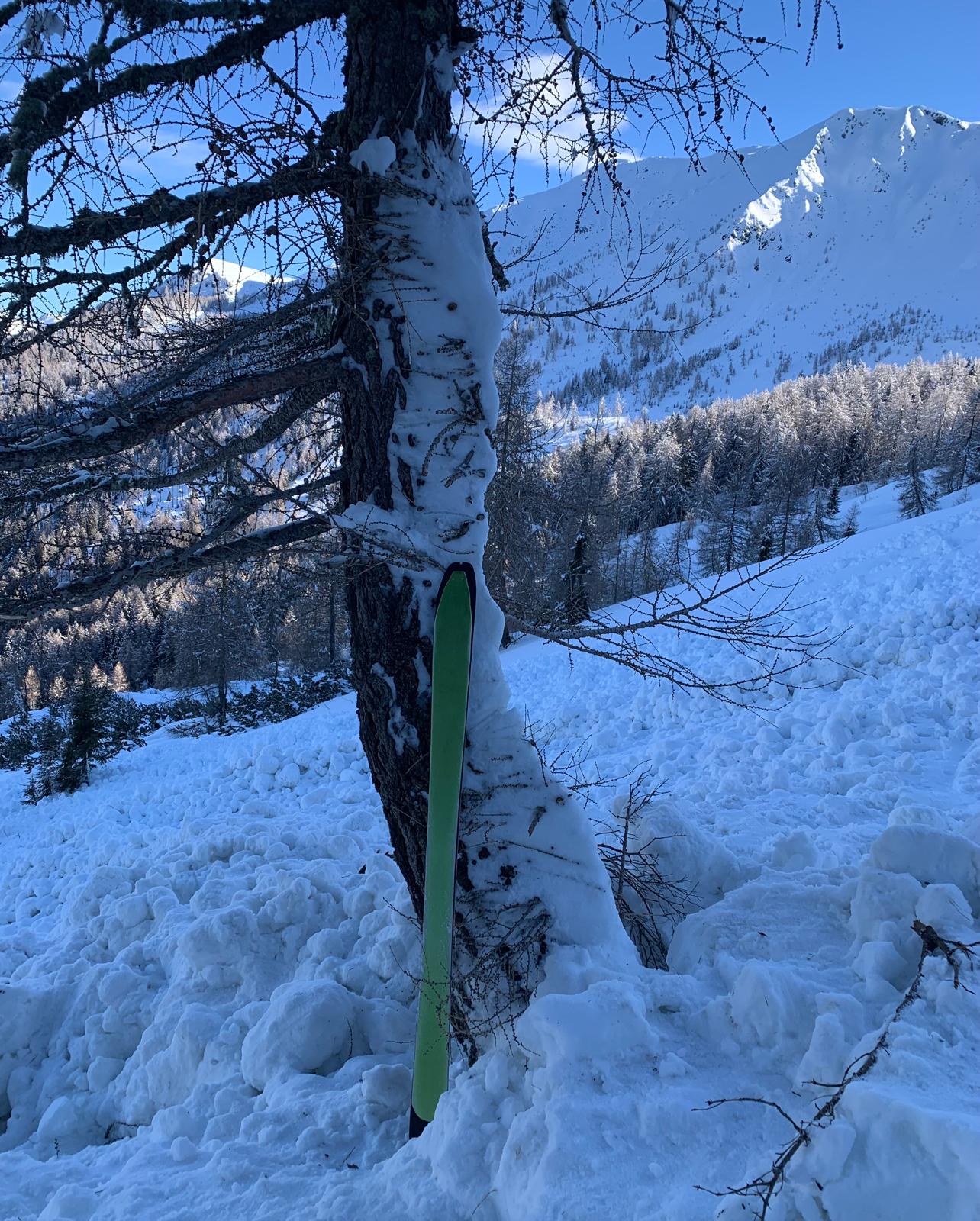 Altezza di scorrimento di alcuni metri sul testimone “muto” del tronco del larice denota una massa di neve movimentata importante.